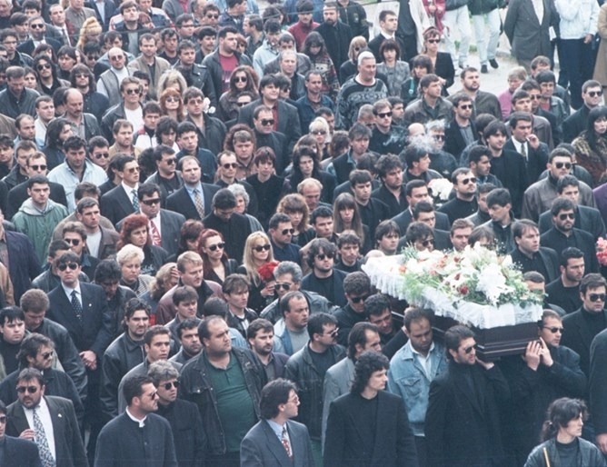 Хиляди хора се стичат на погребението на Васил Илиев на 27 април 1995 г. Траурното шествие минава през целия Кюстендил. Отпред единия кръст носи Димитър Димитров - Маймуняка (вдясно).