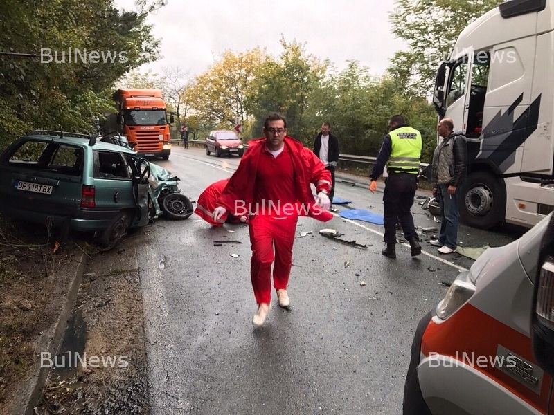 Апокалипсис на Е-79 край Ребърково! Трупове лежат на пътя, има загинало дете /ужасяващи снимки/ Жестока катастрофа е станала преди минути на международния път Е-79 край врачанското село Ребърково, видя първо репортер на информационна агенция BulNews.bg. Лек автомобил „Опел Астра“ с врачанска регистрация е поднесъл на мокрия път при влизане в Турския завой и се е размазал в пътуващ към София плевенски ТИР. На място е загинал възрастният шофьор, а на асфалта лежат две от децата, които са били в колата. Репортерът на BulNews.bg се включи в борбата да бъде извадено третото дете, което беше затиснато в смазания автомобил. Гледката е толкова ужасяваща, че хората, които помагат се държат за главите от трагедията, която е пред очите им.