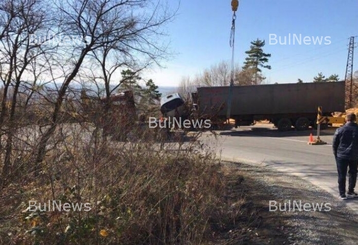 По обяд започна операцията по вдигането на ТИР-а. На място пристигна кран, който се опитва да премести камиона от платното и да освободи движението.