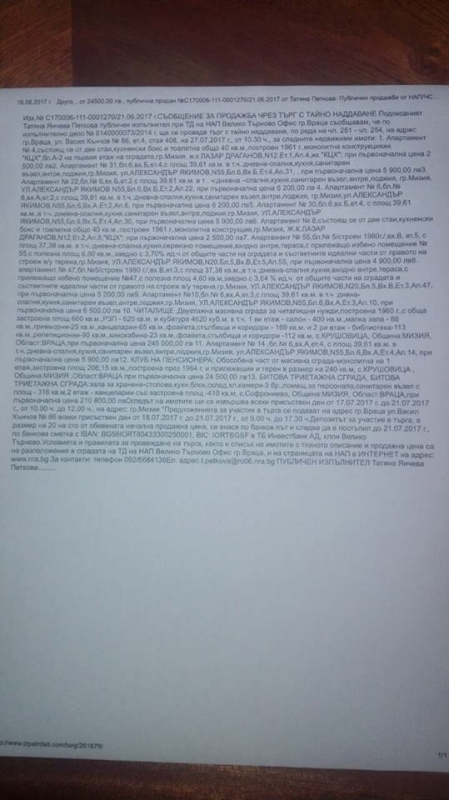 Началото на изпълнителното дело е поставено още през 2014, както е видно от документите, които публикуваме. Обявлението пък за продажба чрез търг на въпросните сгради е от 21.06.2017 г.. От тогава до сега градоначалникът Виолин Крушовенски и екипът му кой знае защо не са информирали за фактическата ситуация нито Общинския съвет, нито ползвателите на сградите в двете села. Първата насрочена дата за търг дори е минала, насрочена е и втора такава през септември, като цената на имотите съответно е намалена.