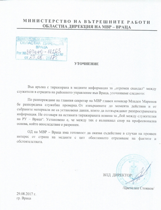 Пет дни, след като информационна агенция BulNews.bg съобщи първа за срамните сцени в сградата на районното полицейско управление във Враца, от областната дирекция измислиха официална версия за случилото се. Според данните от проверка, назначена от главния секретар на МВР Младен Маринов, в сряда бой между служители не е имало, а само „професионален спор, който впоследствие е разрешен“. Така случаят се замита под килима, главата на шефа на районното Георги Митов оцелява и остава да се чакат други времена, когато истината ще има шанс да излезе на светло.