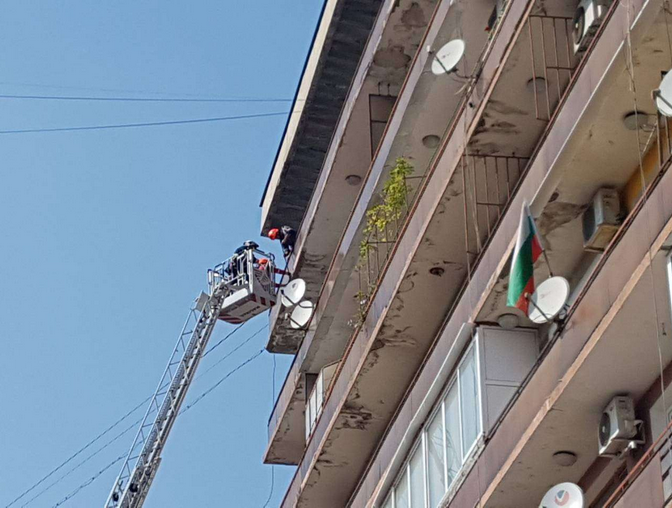 По щастлива случайност точно в този момент по тротоара не е минавал никой и няма пострадали хора. Екип на регионалната дирекция "Пожарна безопасност и защита на населението" е отцепил района. С помощта на дълга 40-метра пожарникарска стълба екип срутва и останалата част от мозайката, която е надвиснала опасно и всеки момент може да падне.