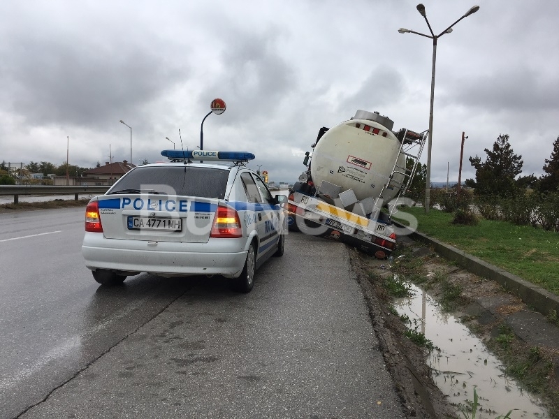 На мястото е дошъл екип на полицията, който обезопасил участъка, за да не се удари някой в камиона. Очаква се да пристигне специализирана техника и цистерната да бъде изтеглена. Докато трае операцията движението в района ще бъде затруднено, затова съветваме шофьорите да карат с повишено внимание.