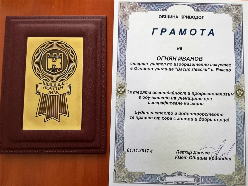 Петър Данчев - Кмет на Община Криводол връчи поздравителни адреси на просветните и културни дейци от общината. С грамота и почетен знак бе удостоен Огнян Иванов – старши учител в ОУ „Васил Левски“ с. Ракево за приноса му в развитие на творческите заложби у подрастващите. Огнян Иванов обучава възпитаници на училището в иконопис и стъклопис. Под вещото му и всеотдайно ръководство децата полагат много усилия, но се радват на постигнатото. Вече над 20 икони са изографисани по правилата и в подходяща цветова гама. Своите изключителни творби – икони и стъклописи – учениците представиха в изложба „Изкуството ни обединява“ на празника на Криводол. За своята всеотдайност и професионализъм, за голямото и добро сърце Огнян Иванов получи заслужено признанието за будителство и добротворство на този светъл и духовен празник.