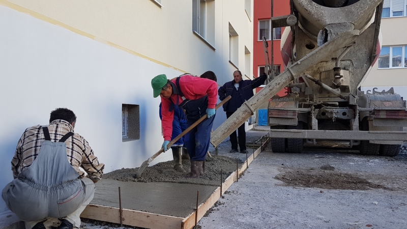 Служители на комуналното предприятие благоустроиха зоната пред северната фасада на бл.2 в гр. Мездра като изградиха бетонов тротоар пред сградата.