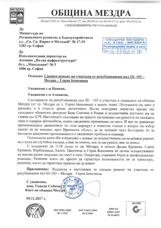 Апел за осъществяване на спешен ремонт на републиканския път III-103 в участъка от Мездра до село Горна Бешовица изпрати кметът на община Мездра инж. Генади Събков до Министерството на регионалното развитие и благоустройство и Агенция пътна инфраструктура. Кметът алармира министър Николай Нанков и инж. Дончо Атанасов за лошото състояние на трасето, по което се осъществява интензивен трафик, а преминаването по него е рисковано.
