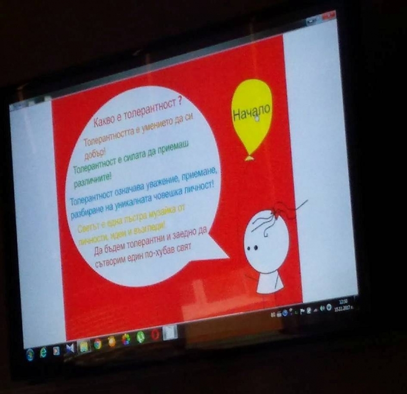 Учениците от 10 в клас на профилираната природо-математическа гимназия бяха гости на третокласници от НУ „Св. Софроний Врачански“. Поводът бе Международния ден на толерантността, който се отбелязва на 16 ноември. Възпитаничката на ППМГ – Враца Надежда Красимирова представи своя проект от Националната олимпиада по ИТ 2017 – „Бъди толерантен“, а всички заедно изработиха „Пъзел на толерантността“ и си обещаха да бъдат по-добри, искрени, да уважават себе си и всички, с които общуват.