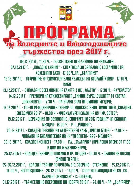 С богата и разнообразна програма, включваща множество културни и спортни мероприятия, oбщина Мездра ще зарадва своите жители и гости в празничния месец декември.