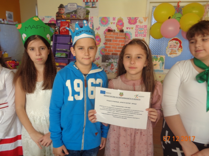 В очакване на Дядо Коледа и предстоящите светли християнски празници, учениците от 3 „А“ клас на Средно училище „Христо Ботев“-Враца, участващи и в група по интереси по проект „Твоят час“- „Млади краеведи“ с ръководител Наталия Андреева посетиха своите по-малки приятели от детска градина „Детски свят“. Малките актьори представиха пиесата „Дванадесетте месеца“, зарадваха мъниците с подаръци и картички. Децата от детската градина поздравиха гостите с песнички и стихотворения и …сме сигурни, че Дядо Коледа ни е видял и чул. Беше страхотен празник, както за учениците, така и за дечицата от прекрасната детска градина „Детски свят“. С малко носталгия и много любов ученици от 8 „В“ клас се включиха в празника.