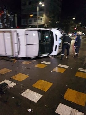 На кръстовището на бул. „Цар Освободител” и бул. „Осми Приморски полк” полицейският микробус "Форд" се е ударил с два леки автомобила "Рено".