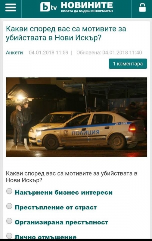 Но не за това доколко хората са потресени, а за да се произнесат досущ като разследващи какъв е мотивът за убийствата, според тях. Анкетата бързо взриви социалните мрежи, където хората не криеха възмущението си от прекрачването на границите и цинизма на подобно допитване сред аудиторията.