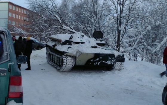 Жител на руския град Апатити, Мурманска област, отиде да си купи алкохол с брониран верижен влекач МТЛБ.
