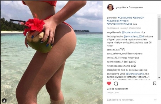 Малката дива Гери-Никол не спира с провокативните снимки от Сейшелите. След като се пусна за първи път без горнище, то днес тя показа сочните форми на дупето си. Фурията, чиято звезда изгря на музикалната сцена с участието й в "Х фактор", пак показа тяло, на което биха завидели много холивудски звезди. Формите й доближават тези на знаменитости като Джей Ло, Ники Минаж, Риана и Бионсе. Самата Гери твърди, че не използва фотошоп, а всяка снимка е натурална и е горда с това.