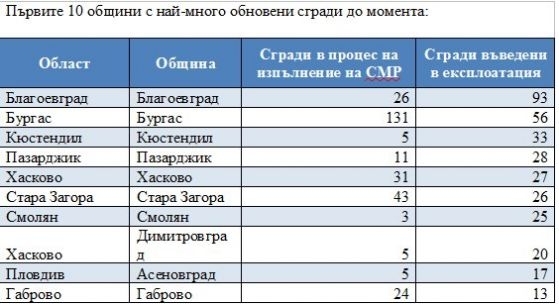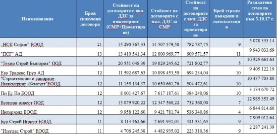Общо за цяла България само три фирми имат сключени контракти за обновяване на повече сгради, показват данните на МРРБ. Това са „НСК София” ЕООД (21 сгради), "ПСГ" АД и "Техно Строй България" ООД - по 13 сгради.