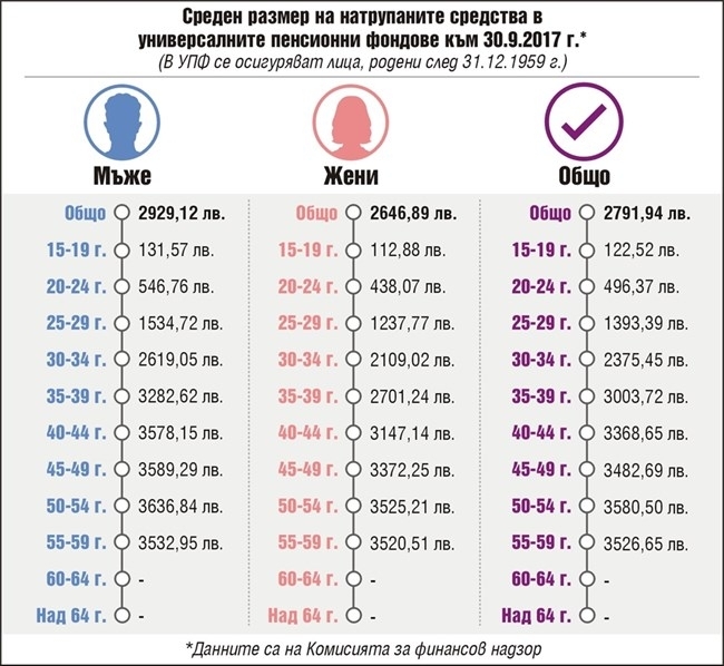 В универсалните фондове има над 3,6 млн. партиди. Хората в предпенсионна възраст, които ще са първите с държавна и частна пенсия, имат средно по 3527 лв. Това са работещите на възраст 55-5 г., които са близо 276 хил. души. Сумите по тях са се увеличили за 1 г. средно с 474 лв.