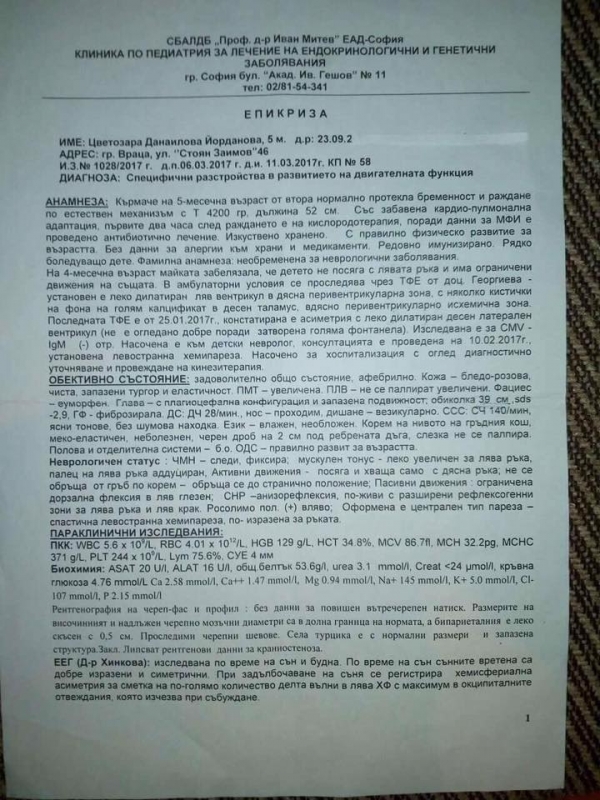 Малката Цвети е на годинка и 4 месеца, доносено бебе, което при раждане се задушава и това има своите последствия. Крайната диагноза е левостранна хемипареза. Цвети не може да използва лявото краче и лявата ръчичка и не може да седи и проходи като всички здрави деца на нейната възраст.