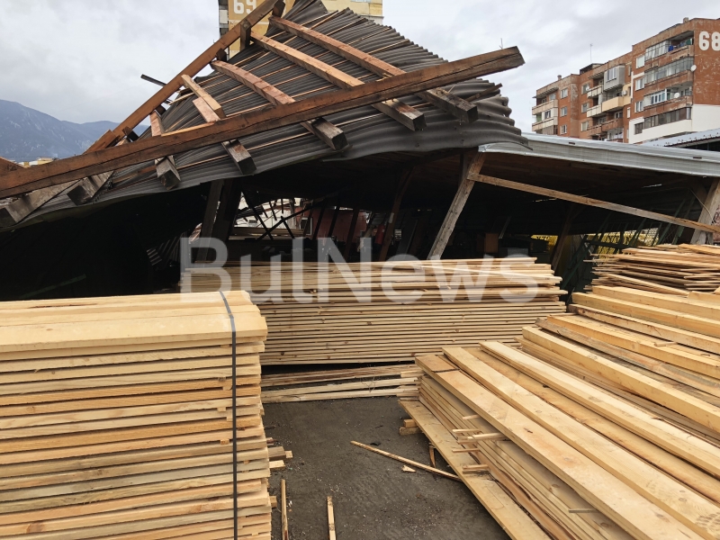 Снощи около 21 часа бурята вдигнала покрива на склад за палети и въглища, който се намира на Криводолско шосе и го запокитила върху съседен склад за дървен материал. Разстоянието между двата е повече от 50 метра и въпреки това огромната конструкция е преместена без проблем.