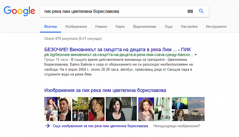 По същото време любимият на Пеевски и Цацаров сайт ПИК пусна статия със заглавие с огромни букви: БЕЗОЧИЕ! В нея пише: Действителните виновници за трагедията - Цветелина Бориславова, Байко Байков и хора от обкръжението им се разхождат необезпокоявани на свобода. На 4 април 2004 г., около 20:20 часа, автобус, превозващ деца от Свищов пада в студените води на река Лим.
