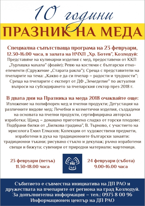 На 23 и 24 февруари 2018 година в Козлодуй за десета поредна година ще се състои Празник на меда – една съвместна инициатива на Държавно предприятие „Радиоактивни отпадъци” и дружествата на пчеларите от региона.