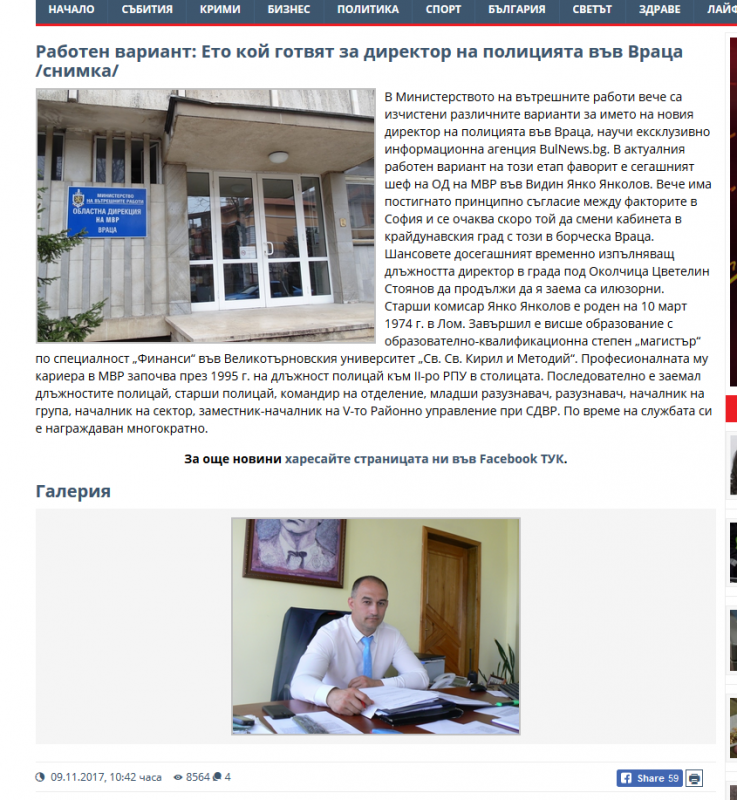 9.11.2017 г.: BulNews първа и единствена съобщава кой ще е новият директор на полицията във Враца
