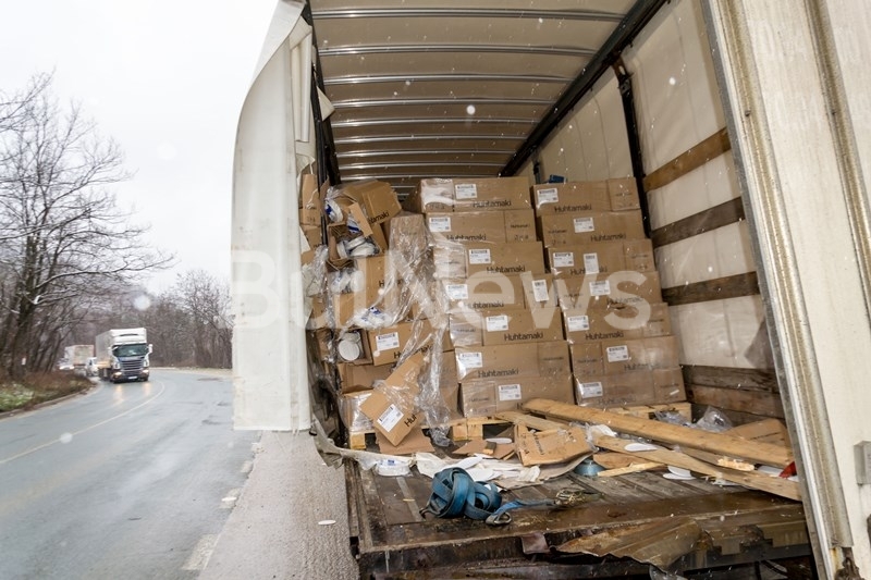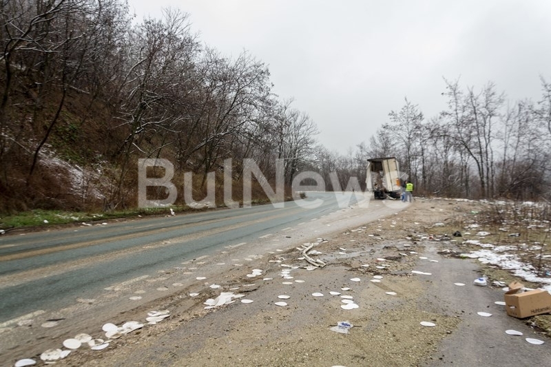 Камион със софийска регистрация е пътувал по главния път в посока Ботевград, когато при спускането в местността Копяновец се спукали две въздушни възглавници на ремаркето. То се наклонило на една страна и удрило кабината на друг тир, който се движел в обратната посока. При катастрофата няма пострадали. От ремаркето на софийския тир се разпилял част от товара- хартиени чинийки за еднократна употреба. Изпадналия товар обаче не затрудняват движението. Камионите са изтеглени на отбивки край пътя и преминаването през участъка е нормално. На място има полиция.