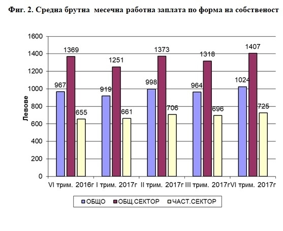 Анализът на цифрите сочи още, че нарастването на заплатите в обществения сектор върви с по-бавни темпове, а заради малките заплати и липсата на кадри частниците са принудени по-бързо да повишават заплатите на служителите си. Въпреки това за обществения сектор средната месечна работна заплата е 1 407 лева, а за частния - 725 лева.