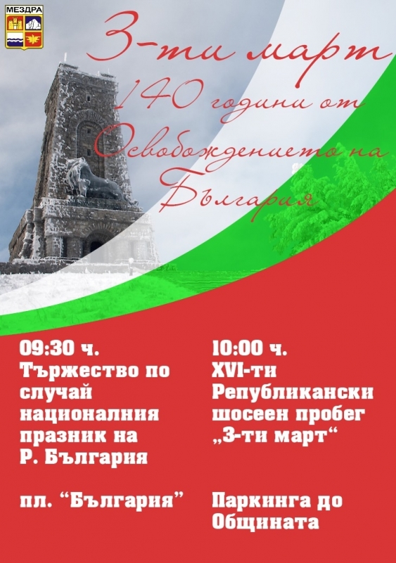С богата музикална и художествена програма община Мездра ще отбележи 140 години от освобождението на България от Османско владичество. Тържеството ще се проведе на пл. „България“ и ще започне в 9.30 ч. на 03.03.2018г.