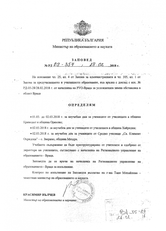Със Заповед № РД 09-354/28.02.2018г. на Министъра на образованието и науката- Красимир Вълчев, 02.03.2018г. /петък/ е определен за неучебен ден за учениците от Средно училище „Св. Климент Охридски“- село Зверино.