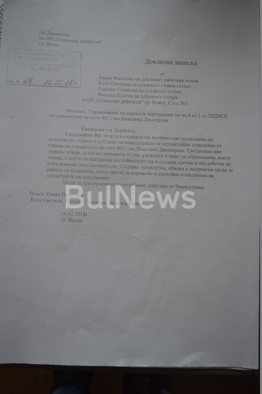 След оповестяването на скандалните разкрития две от служителките вече са получили устни разпореждания, че ще започнат работа в друг стол в града. Отговор обаче на сигналите и докладните си срещу Димитрова още не са получили.