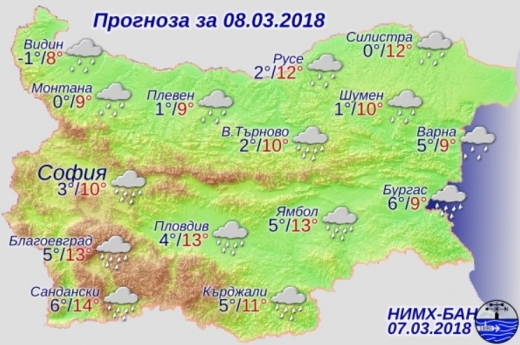 Максималните температури ще са между 8 и 11 градуса. Температурата на морската вода е 5-7 градуса. Вълнението на морето ще е 2-3 бала. Над планините ще бъде облачно и с валежи от сняг, под около 1800 метра валежите ще са от дъжд. Ще духа умерен и силен вятър от северната четвърт.