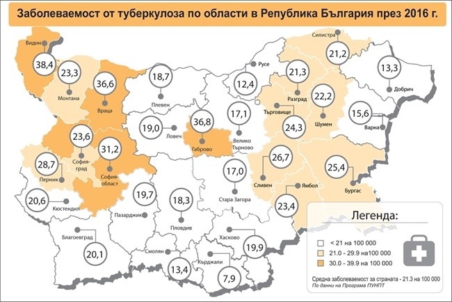 Близо два пъти повече са хората, боледували от туберкулоза във Видин и областта през 2016 г. спрямо средните за страта нива. В крайната северозападна област от туберкулоза са се разболели 38,4 души на сто хиляди население при средно за България 21,3 души.