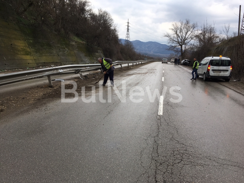 В момента служители на областното пътно управление разчистват пътното платно от разпилените чаркове. Има обаче и разлято гориво по асфалта. Най-вероятно ще се наложи екип на пожарната да измие шосето, за да не се поднесе някоя кола и да стане ново произшествие.