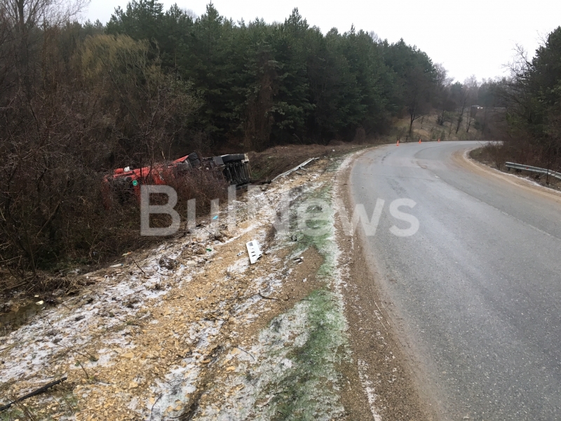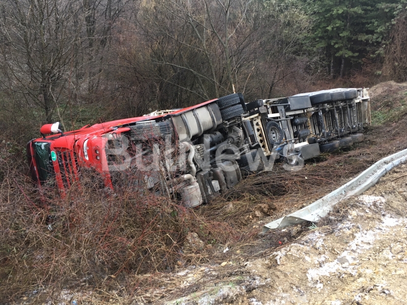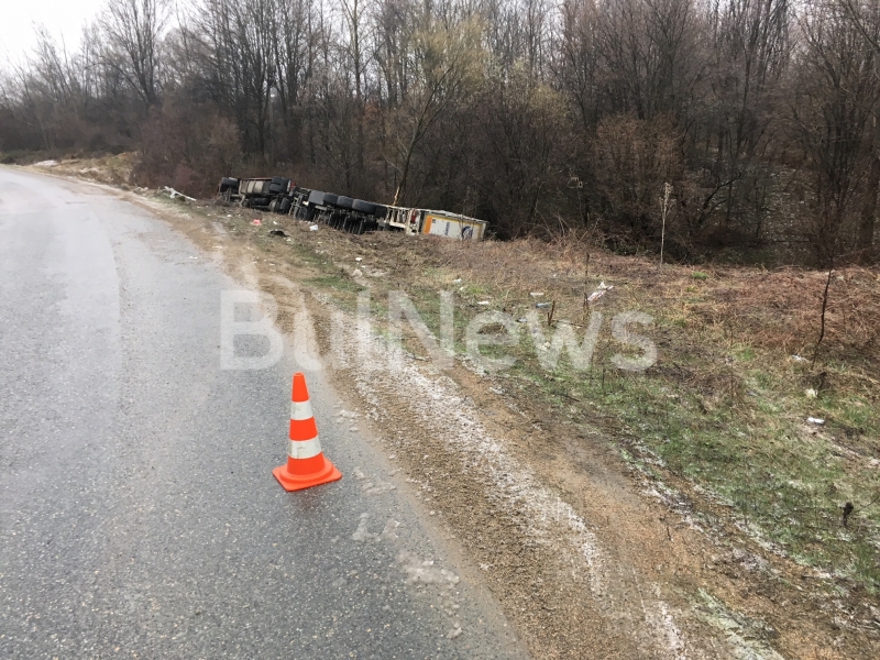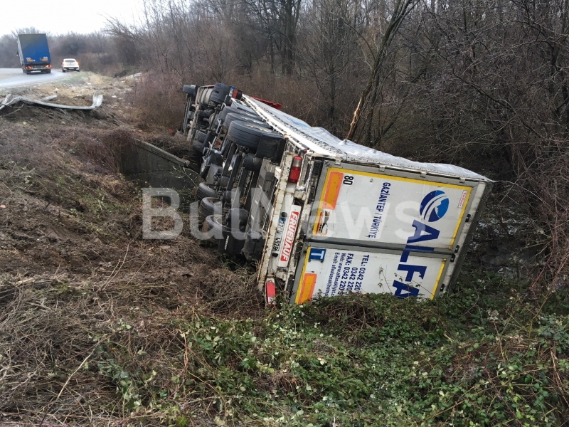 Минаващи шофьори се обадили на тел.112 и на мястото пристигнала линейка, която закарала турския водач в болница. По неофициална информация той има счупвания и ще остане за лечение.