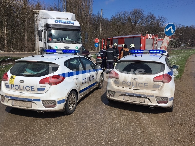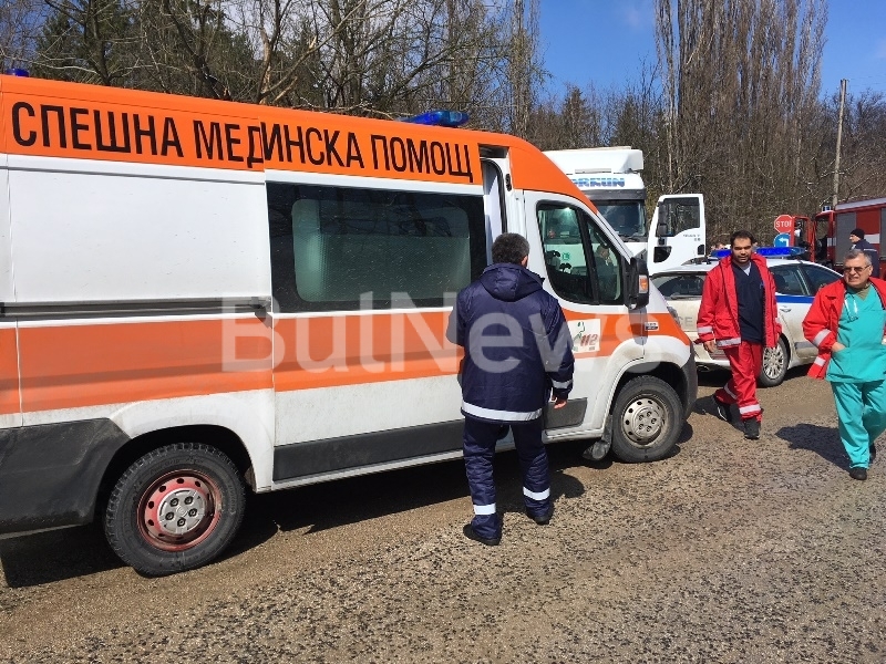 На място има две пожарни и две линейки. Екип спасители източват резервоара на тира, за да не се взриви.