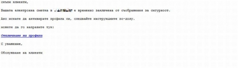 „Скъпи клиенти, Вашата електронна сметка е временно заключена от съображения за сигурност. Ако искате да активирате профила си, следвайте инструкциите“, пише в съобщението, подписано от „Обслужване на клиенти“.