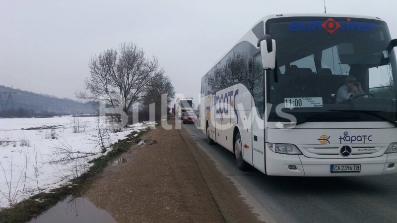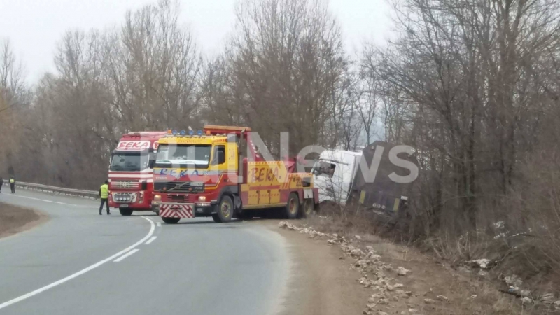 Международният път е блокиран от около час и в двете посоки, поради което са се образували големи колони от чакащи автомобили. Две тежкотоварни специализирани машини са на мястото в момента, за да изтеглят камиона.