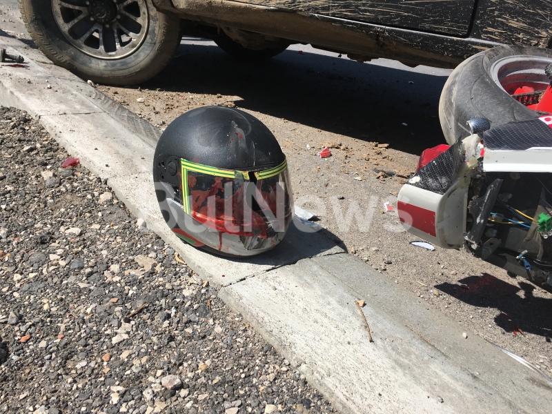 Рокерът е тежко ранен, каската му е счупна и обляна в кръв. Кръв има и около мястото на катастрофата.
