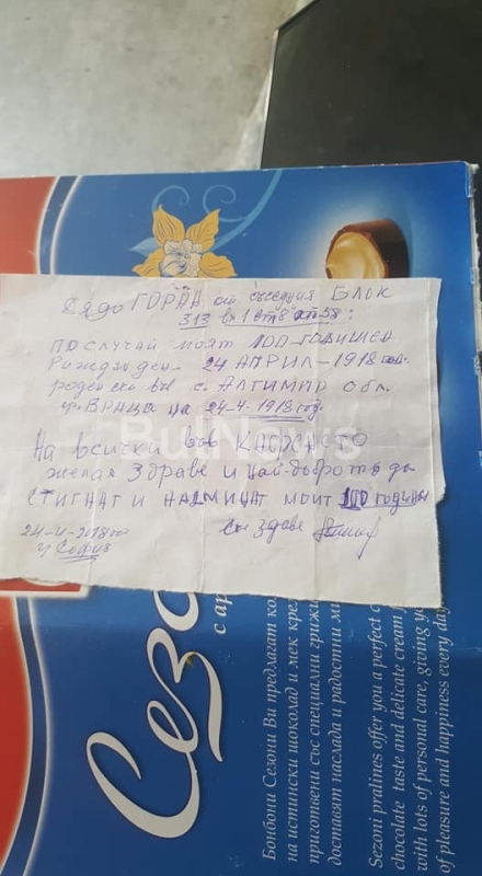 „По случай моя 100-годишен рожден ден – 24 април 1918 година (роден съм в село Алтимир, област Враца). На всички в кафето желая здраве и най-доброто - да стигнат и надминат моите 100 години“, се казва в бележката, под която столетника собственоръчно се е подписал.