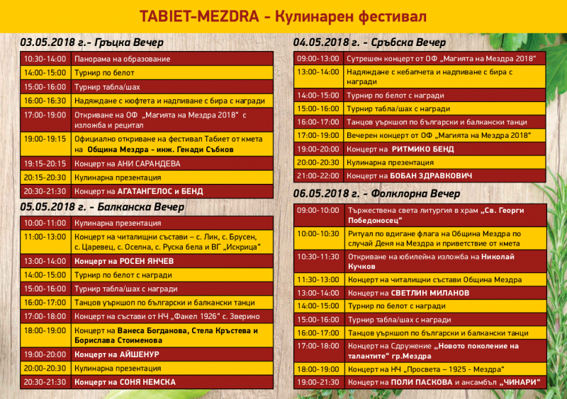 С концерт от „Магията на Мездра 2018“ ще започне вторият ден от „Табиет“ феста в Мездра. Малко след 9 сутринта местни групи и състави ще покажат уменията си на фестивалната сцена. През целия ден организаторите са предвидили множество концерти и кулинарни дегустации, както и много награди за участващите в турнирите по белот, шах и табла. Точно в 19.00 започва Сръбската вечер от четиридневния Фест. Гост- изпълнители ще бъдат „Ритмико Бенд“, а вечерта ще бъде закрита от легендата на сръбската фолк музика Бобан Здравкович. На сцената под звездите в Мездра той ще изпълни едни от най-големите си хитове ( „Lepa žena“ и „Поне за ден“, „Dve obale“, „Отказвам да приема“) и много други.