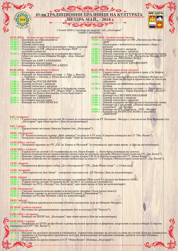 С изключително богата и разнообразна програма ще бъдат отбелязано 45-то издание на традиционните празници на културата „Мездра май“. Общината е подготвила над 40 културни и спортни мероприятия, с които да задоволи предпочитанията на жители и гости на Мездра от различни възрастови групи.