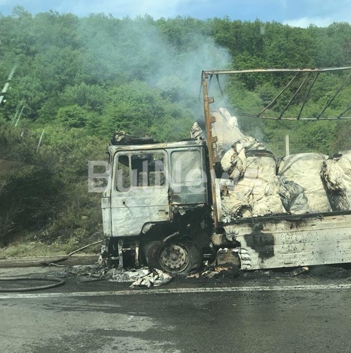 В момента на място екип огнеборци гасят пламъците, обгърнали голямото превозно средство. По първоначална информация е изгоряла цялата шофьорска кабина и едно от двете ремаркета, което е пълно с топове хартия. Другото все още не е засегнато от пламъците.