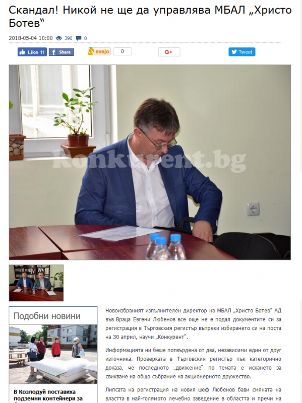 Фабриката за фалшиви новини, която бичи яко в редакцията на врачанския вестник „Конкурент“, извади нова продукция, установи проверка на агенция BulNews.bg. Днес в сайта на изданието бе публикуван материал със стресиращото заглавие „Скандал! Никой не ще да управлява МБАЛ „Христо Ботев“, в който по брутален начин е направен опит да бъде манипулирано общественото мнение. Поместеният текст е откровена лъжа, която е част от атаката на „Конкурент“ срещу най-голямата болница в Северозападна България. Главният редактор Георги Александров, известен и като Гошо Синдика, тиражира твърдението, че все още не са подадени документите за вписването на новия изпълнителен директор и какво означавало това за бъдещето на здравното заведение.