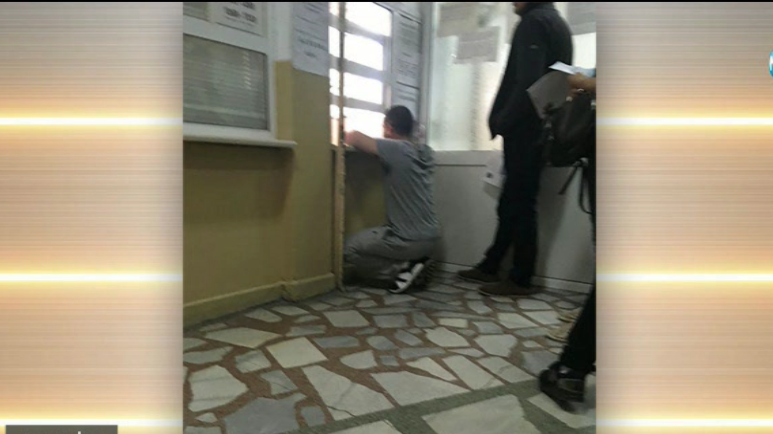 В сградата на Пътна полиция в града се чака на гишето за клиенти именно в такава поза.
