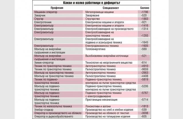 Още 23 професии трябва да бъдат включени в списъка на защитените. Сред тях са недостигащите от години заварчици, стругари, механици, електротехници. Включват се и химици със средно образование. Най-голяма ще е липсата на транспортни техници, където липсата ще достигне 10 хил. души, става ясно от мотивировката на предложението.