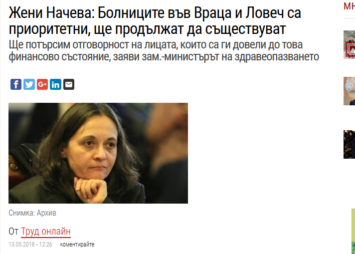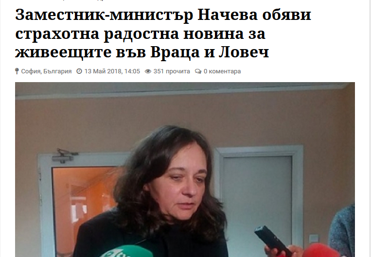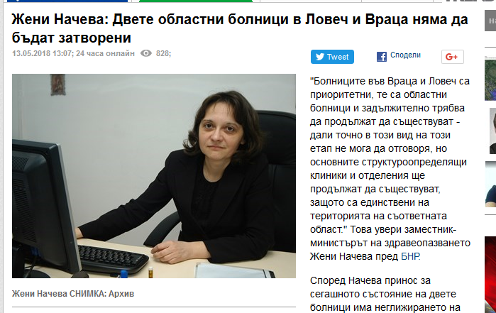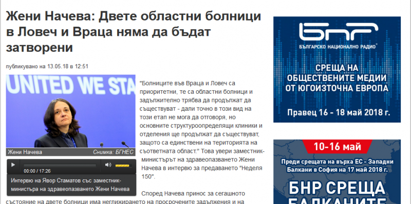 „Жени Начева: Държавата не може да помогне на врачанската болница“, което нямаше нищо общо с казаното от зам.-министъра на здравеопазването. Тъкмо обратното: тя категорично заявява пред БНР, че болницата е приоритетна и ще продължи да съществува. Любопитното е, че все още главният редактор Георги Александров е единственият, който пуска интервюто с негативно заглавие. Дали това е заради некадърност или някой собственик на частна болница го мотивира – този извод оставяме за обществеността. Заглавието обаче е типичен пример за фалшива новина.