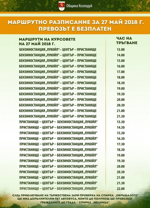 За удобството на жителите и гостите на общината е организиран безплатен градски транспорт. Първият автобус ще тръгне в 13:00 часа от бензиностанция „Лукойл”. На всяка спирка в града ще има разписание на транспорта през целия ден, което ще бъде публикувано и в сайта на Общината. Вечерта, след приключването на зарята, пред входа на Ботев парк, на спирка „Обръщалото”, ще има допълнителни 5 (пет) автобуса, които ще извозват гражданите към града до полунощ.