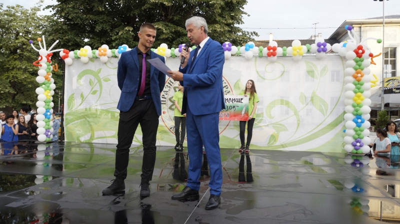 Александър Георгиев от Сдружение „Ново поколение на талантите“ отправи музикален поздрав с прекрасно изпълнение на песента „Ти“ и поднесе подарък на абитуриентките Ивана Иванчева и Цветомира Цветанова, солистки във вокална група “Wings”.