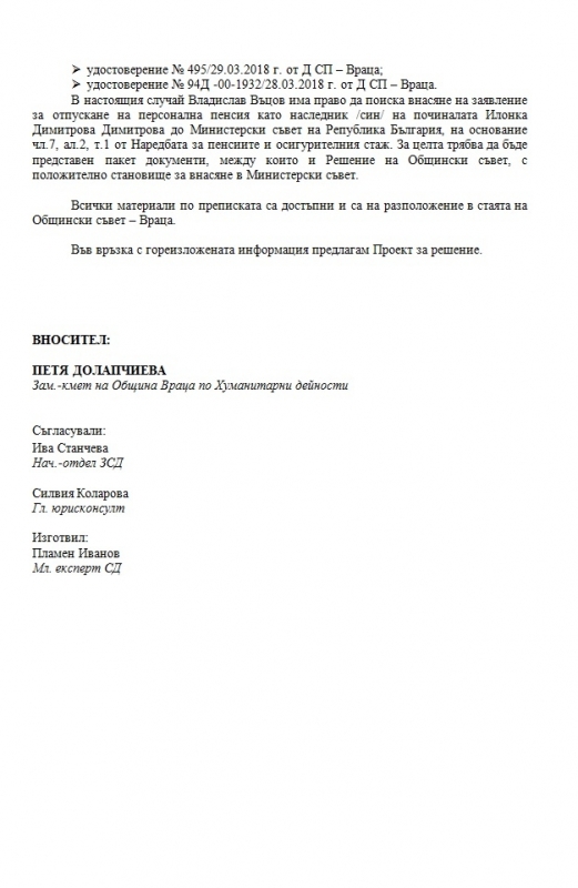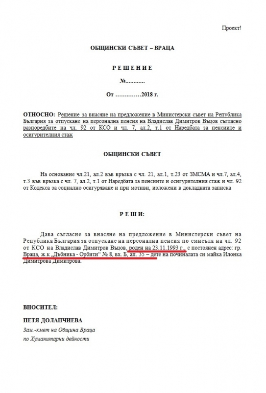 Факт е, че общинарите искат да помогнат на младия мъж да получи персонална пенсия и за целта трябва да дадат положително становище до Министерски съвет на Република България. Одобрението им е наложително, тъй като врачанинът, останал без майка, е отрязан от НОИ за наследствена пенсия - не отговарял на условията за отпускане на такава пенсия.