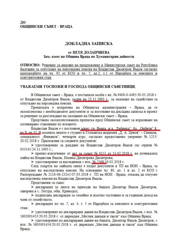 От близо две седмици на сайта на община Враца е публикувана докладна за предстоящата сесия на общинския съвет. В документа млад врачанин моли да му бъде отпусната персонална пенсия. От докладната не става много ясна историята на младежа, но пък повече от ясно се четат всичките му лични данни – адрес, дата на раждане, серийният номер на акта му за раждане, както и куп други удостоверения и декларации. Докладната е внесена за разглеждане пред общинските съветници от зам.-кметът Петя Долапчиева и трябва да бъде гласувана днес. За финал в документа е записано, че всички материали по преписката са достъпни и са на разположение в стаята на общинския съвет във Враца.