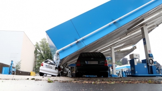 Покривът на бензиностанция във Вупертал е паднал върху няколко коли.